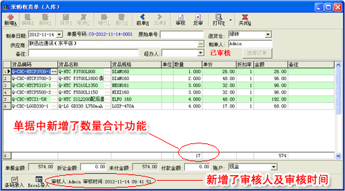 單據(jù)中新增了數(shù)量合計(jì)功能,并新增了審核人及審核時(shí)間
