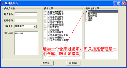 在操作員管理中,增加一個(gè)倉(cāng)庫(kù)過(guò)濾項(xiàng),即只指定管理某一個(gè)倉(cāng)庫(kù),防止錄錯(cuò)庫(kù)