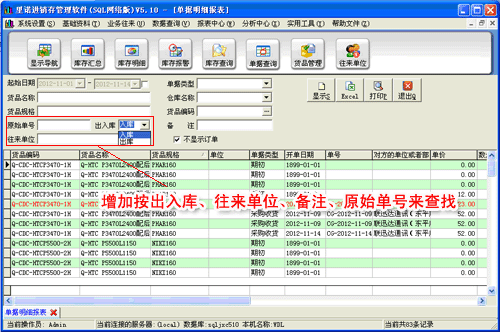 單據(jù)明細(xì)報(bào)表中,增加按“出入庫(kù)”,“往來(lái)單位”,“備注”,“原始單號(hào)”來(lái)查找