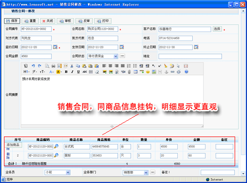 管理員在制做銷售合同時,可以添加商品資料,里諾客戶服務管理系統有專門的報表可以統計出合同金額(區別于銷售金額,因為不是所有的合同都會執行,所以合同金額和銷售金額按月統計會不相等)。
