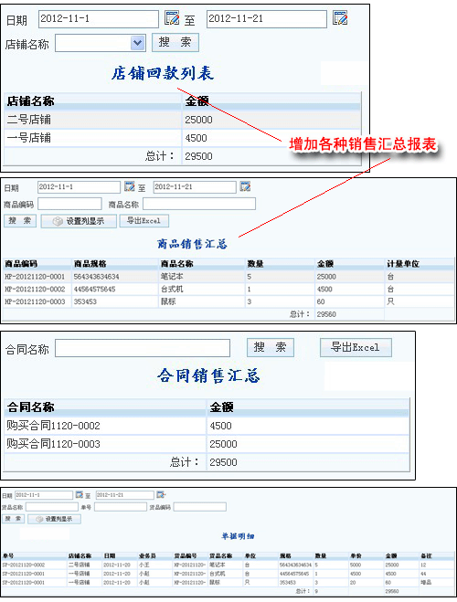 作為總經理,最關心的是各個店鋪的銷售情況,日回款情況和業務員每月的業績。所以我們在2.50版中增加了合同銷售金額匯總表、商品銷售匯總表、店鋪回款匯總表、單據明細表、日回款匯總表,業務員業績統計報表等幾個實用的報表,方便經理統計決策!