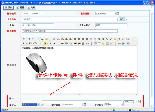 售后服務模塊現在不僅能記錄文字信息,還能記錄圖片信息。如果您銷售出去的產品出了問題,把圖片信息記錄在案有助于技術員發現和解決問題。
