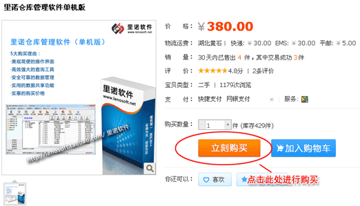 在里諾倉(cāng)庫(kù)管理軟件單機(jī)版淘寶頁(yè)面中點(diǎn)擊“立即購(gòu)買”