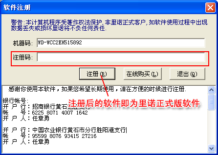 通過(guò)里諾軟件匯款賬戶付款給我們,并且通知里諾客服,在里諾客服確認(rèn)款到賬后就會(huì)發(fā)送注冊(cè)碼給您進(jìn)行注冊(cè)。