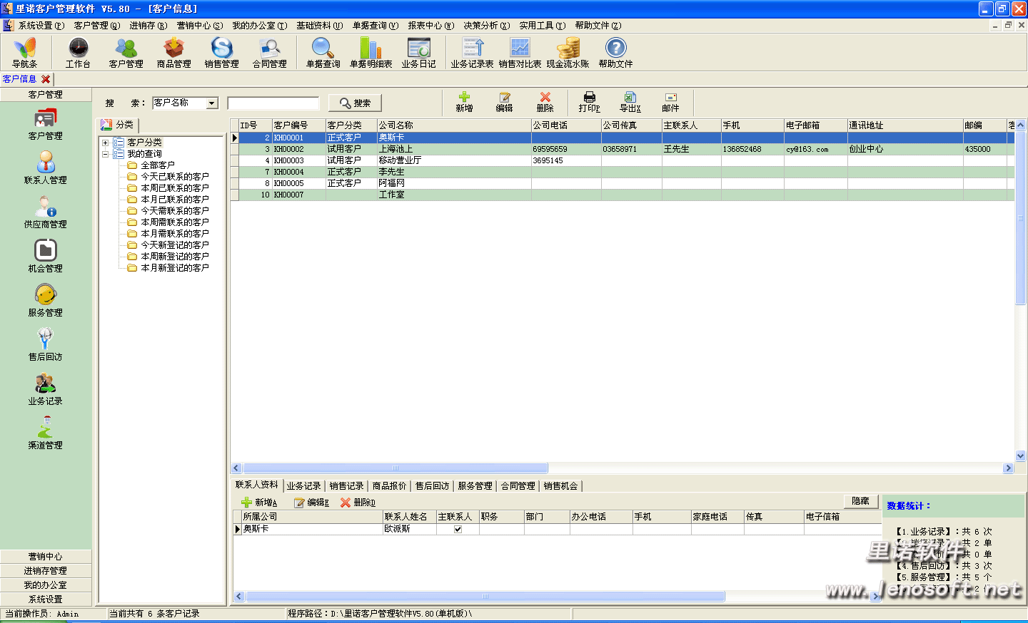 里諾客戶管理軟件是一款集管理客戶檔案、銷售統計、業務往來于一身的管理軟件,適用于大多數的中小型企業。以管理者的思想,在了解行業銷售狀況下,凝聚客戶關系,提升資源價值,將潛在客戶轉變為現實客戶從而迅速的提升銷售量。讓企業在投入較少資金的情況下,輕松享受到使用管理軟件來改進企業及其客戶之間關系的目的。