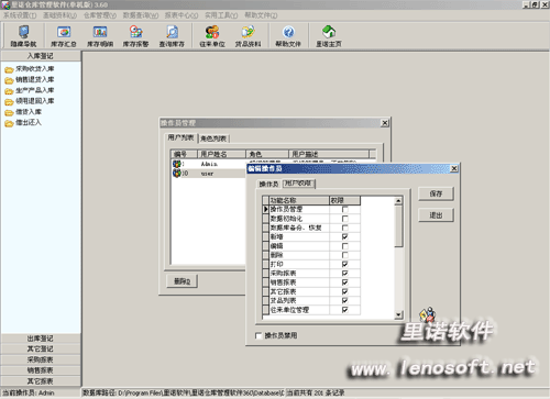 里諾倉庫管理軟件在權限管理上同樣出色,軟件支持自定義角色,支持權限的細分,點擊里諾倉庫管理軟件上面的菜單"系統設置"->"操作員管理",即可進入操作員管理的界面(如下圖所示):
