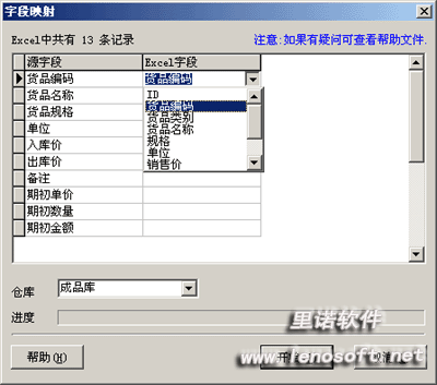 1 當程序沒有自動把字段對應好時,您可以點擊Excel字段相應的項目,從下拉框中選擇一個對應的項目就行了.不導入相應的項目,可以Excel字段中保持為空,例如我不想導入期初單價,我就把Excel字段中的期初單價刪除.