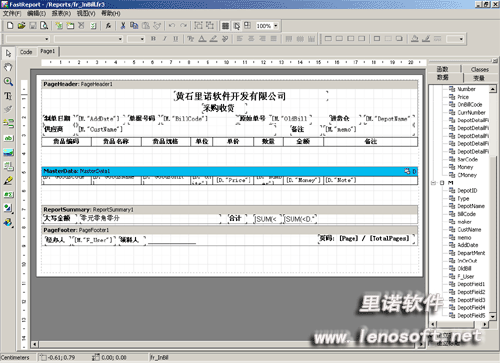 里諾倉庫管理軟件采用最新的FastReport報表控件,能讓單據報表的打印自定義,如下圖所示:
