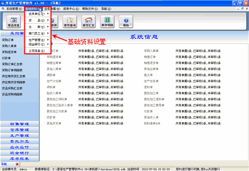 【基礎資料】:在基礎資料中可以對往來單位、貨品資料、倉庫、部門員工、生產管理、現金銀行、公司信息進行設置。方便填寫單據時使用。