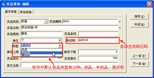 在貨品資料這一部分輸入新增貨品的所有信息,點擊“保存”即可把該貨品保存貨品列表中,保存后可以繼續輸入下一種貨品。在“貨品列表”選中某貨品后可以刪除或編輯;如果貨品增加完后可以直接點“取消”按鈕。退出增加貨品窗口后會在貨品列表中看剛才增加的貨品。如果要修改貨品,先選中要修改的貨品,點擊“編輯”按鈕打開貨品修改界面,在貨品修改界面中修改相應的信息點擊“保存”即可。點擊“刪除”按鈕即可以把選中的貨品刪除。