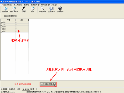 收費(fèi)月份:點(diǎn)擊按鈕,選擇年費(fèi),創(chuàng)建月份。注:只能按照月份的順序來(lái)創(chuàng)建。