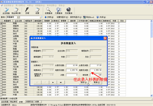 抄表:點(diǎn)擊“抄表”按鈕后即可根據(jù)房屋編號(hào)將數(shù)據(jù)錄入。