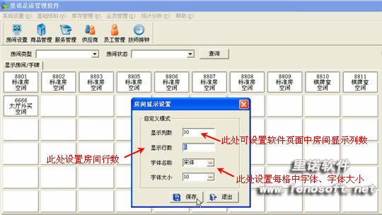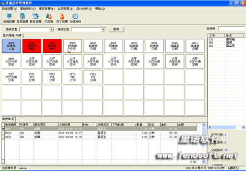 空閑:指房間沒有技師在里面做服務,也沒有客人在房間,空閑狀態的房間顏色為白色,房態圖上顯示為“空閑”兩個字。