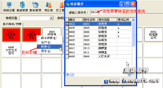轉房的操作很簡單,在“房間狀態”窗口中選擇需要更換房間,再選擇要更換到的房間號,直接點擊“轉房”即可完成操作。更換房間的結果可以在“鐘房狀態”窗口中查看,被更換房間的技師編號已經在原房間看不到了,原房間如沒有技師,會自動變為入客狀態,更換到的房間會顯示換過來的技師編號,服務項目與服務時長仍會接著前面的時間來計算。 |