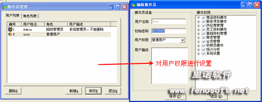 先點擊“新建”按鈕,在彈出的子窗口中輸入“用戶名稱”、“初始密碼”及“用戶權限”右邊的權限列表中該用戶能夠擁有的權限前面劃勾,完成后點擊“保存”按鈕。“修改”指修改用戶名、密碼和操作權限,先選中需修改的用戶名,點擊“修改”按鈕,輸入新的用戶名和密碼,再點擊“確定”按鈕即修改成功。