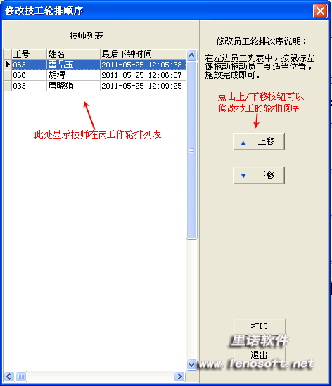 如在此列表中要修改技師的排鐘順序,選中要修改的技師,按住鼠標左鍵拖動到更改的位置,然后點擊“上/下移”按鈕,即可將技師的順序改變。