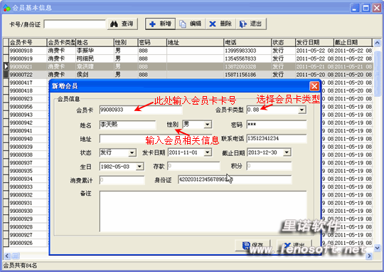 在窗口中可錄入會員姓名、性別、生日、電話、地址、備注,如要進行會員生日管理,則要在此窗口中錄入會員生日,消費累積是統計會員卡所有的消費金額,通過此窗口可查看會員的詳細資料及消費情況,且在會員密碼丟失的情況下可通過此窗口直接進行修改。
