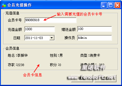 當會員卡余額不多或消費余額不足時,會使用到會員卡充值功能,打開“會員管理”菜單中的“會員卡充值”窗口,先在“卡號”欄中輸入卡號可直接查詢到會員的姓名、電話及余額,充值類型可使用現金充值,然后在“金額”欄中輸入充值金額,還可以采取充值獎勵的形式輸入贈送金額,最后點擊“確定”按鈕完成充值的操作。